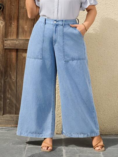 SHEIN LUNE 大码休闲牛仔裤,简约时尚,适合日常穿着 - 淺色水洗藍 - 查看 1