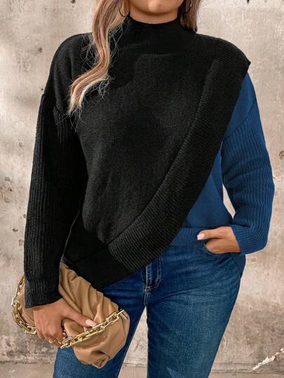 SHEIN LUNE 大码撞色交叉裹身高领休闲套头毛衣,适合冬季和秋季穿着。 - 藏蓝色 - 查看 1