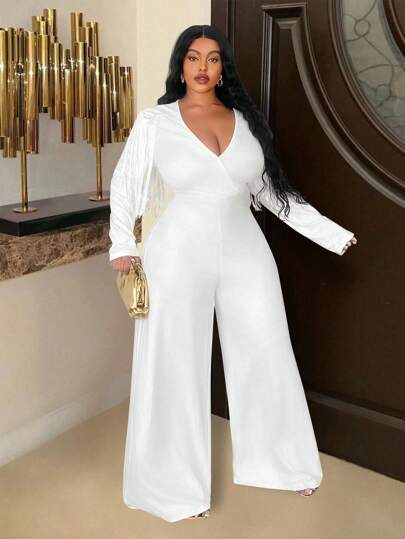 Slaydiva 大码优雅奢华 V 领长袖流苏阔腿连体裤 - 白色,秋冬 - 白色 - 查看 1
