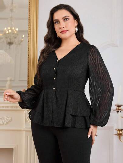 Modelyn 大码优雅纯色镂空腰部衬衫,秋季 - 黑色 - 查看 1