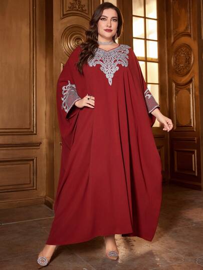 Al Najma 加大尺碼刺繡拼接蝙蝠袖裙 - 紅木色 - 查看 1