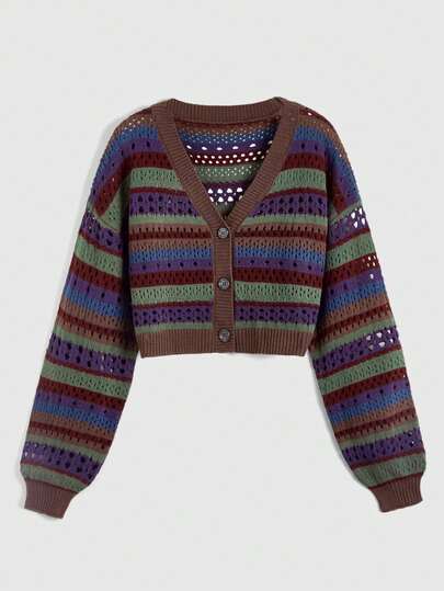 ROMWE Hippie 大码嬉皮复古镂空彩色条纹开衫 - 彩色 - 查看 1
