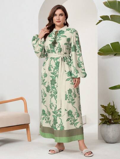 Mulvari 大尺碼燈籠袖花卉腰帶連衣裙,深V領口系帶,非常適合度假 - 彩色 - 查看 1
