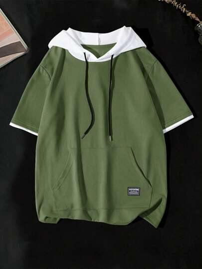 Manfinity Hypemode 大码男式撞色连帽 T 恤,短袖 - 軍綠色 - 查看 1