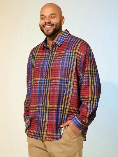 Manfinity VCAY 大码男士宽松休闲格子长袖编织衬衫 - 彩色 - 查看 1
