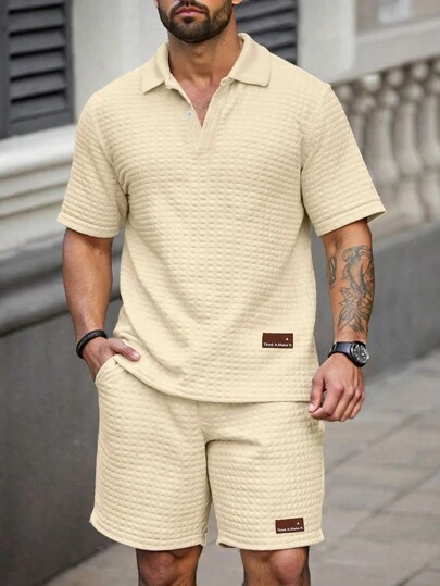 Manfinity Homme 大码男士 Polo 衫和短裤套装,简约时尚的休闲套装,适合日常穿着 - 卡其色 - 查看 6