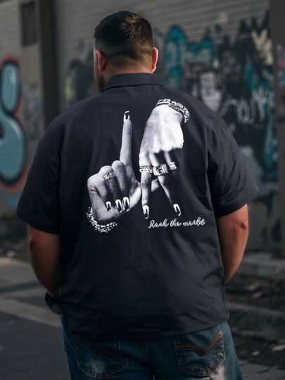 Manfinity VCAY 大码男士街头时尚印花黑色短袖编织衬衫 - 黑色 - 查看 1