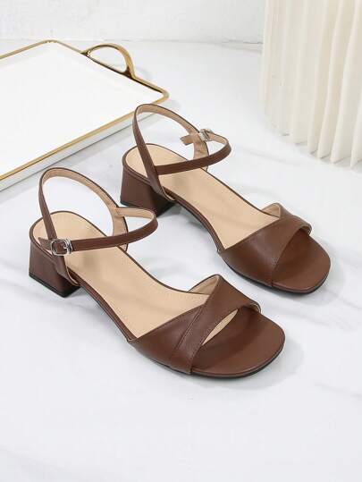 加大码单扣粗跟凉鞋,棕色中跟法式时尚凉鞋,复古露趾踝带经典高跟百搭优雅简约女鞋 - 棕色 - 查看 1