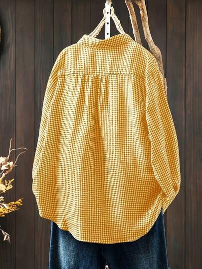 大码格子纽扣前口袋衬衫,优雅日常穿着 - 黃色 - 查看 1