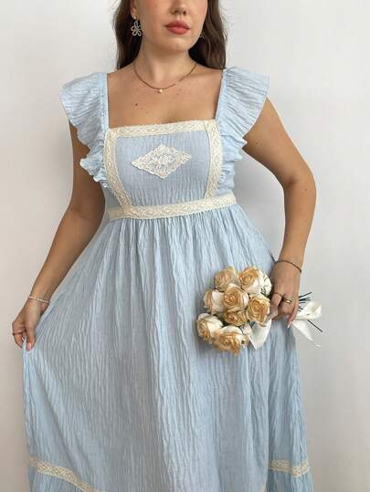 Flirla 大码浪漫花卉拼布方领荷叶边盖袖收腰 A 字连衣裙 - 淺藍色 - 查看 1