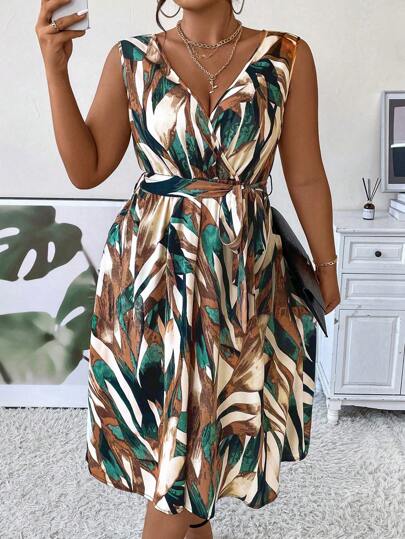 Breezaya 大码无袖全印花腰带连衣裙 - 墨綠色 - 查看 1
