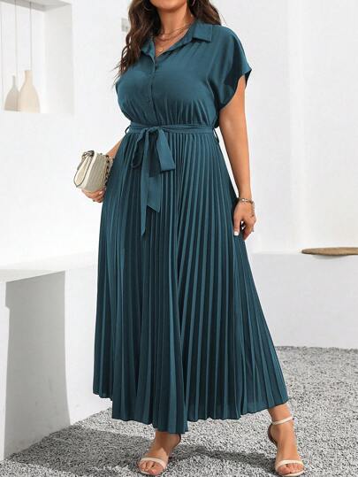 SHEIN Clasi 加大码纯色褶皱腰系带短袖连衣裙,适合夏季长款女装 - 水鴨藍 - 查看 1
