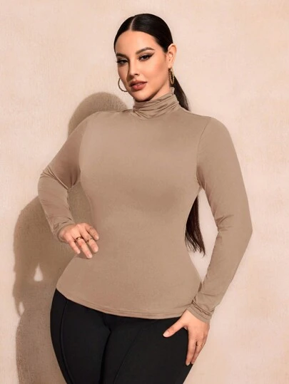 SHEIN SXY 大码纯色修身高领长袖百搭 T 恤基本款 T 恤 - 卡其色 - 查看 1