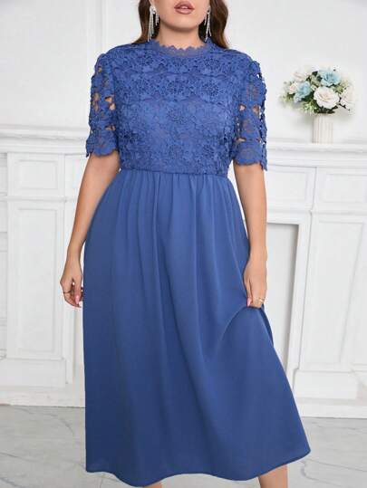 Modelyn 大尺寸純色立領蕾絲拼接優雅短袖夏季連衣裙 - 藍色 - 查看 1