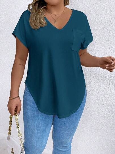 EMERY ROSE 大码纯色 V 领不对称下摆短袖 T 恤 - 水鴨藍 - 查看 1
