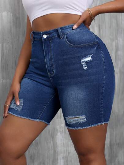 SHEIN SXY 夏季大碼休閒修身磨損破洞牛仔短褲 - 深色水洗藍 - 查看 1