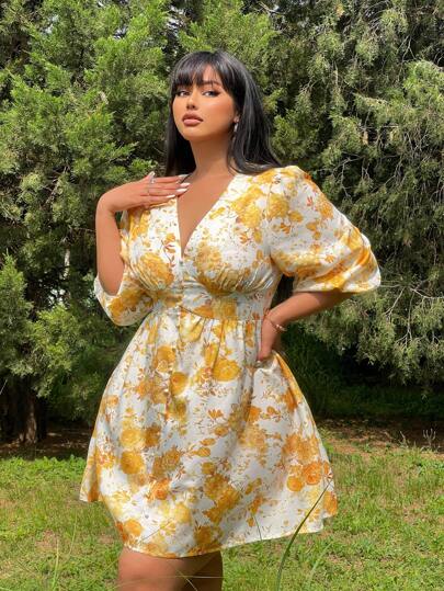 Flirla 大码V领全身印花女式时尚夏季连衣裙度假沙滩装 - 黃色 - 查看 1