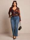Elaquor 大码女式休闲印花荷叶边前系带喇叭袖上衣,秋季性感系带上衣,春季女式上衣