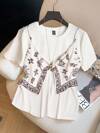 Resyla 大码女式骑士印花拼接条纹短袖休闲圆领T恤