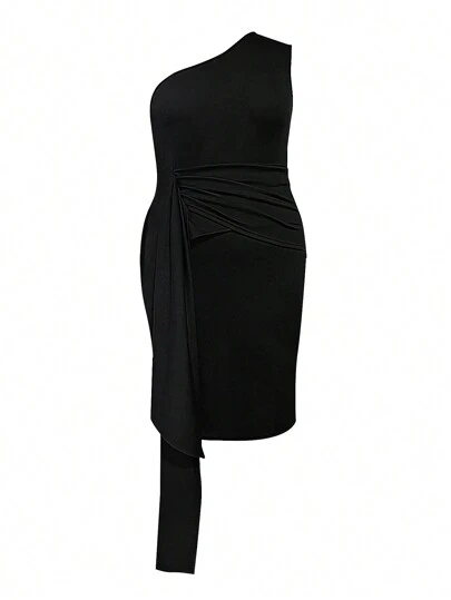 SHEIN Clasi 大尺碼女用荷葉邊一肩無袖連身裙 - 黑色 - 查看 1