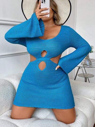 Flirla 大尺碼女士藍色空洞開花鈴袖毛衣連衣裙 - 藍色 - 查看 1