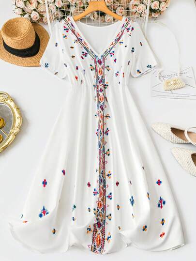 SHEIN LUNE 大码女式彩色图案 V 领短袖优雅夏季连衣裙 - 白色 - 查看 1