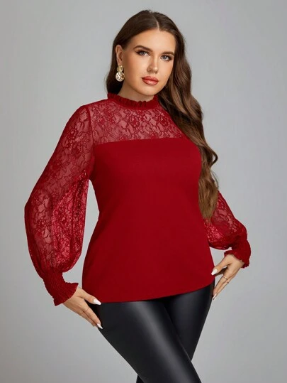 SHEIN Clasi 大尺碼女士鉤花拼接上衣 - 紅色 - 查看 1