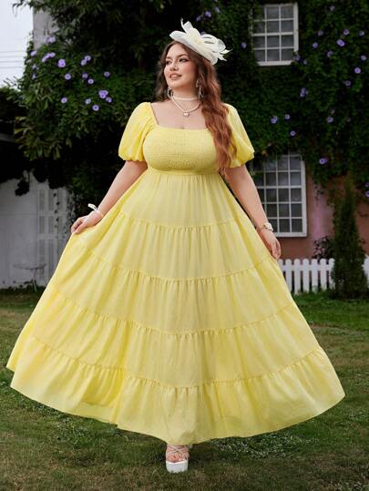 Flirla 大码女式复古泡泡袖荷叶边腰可爱优雅灯笼袖迷你连衣裙,方领,面料拼接长裙,适合春夏派对和旅行 - 黃色 - 查看 1