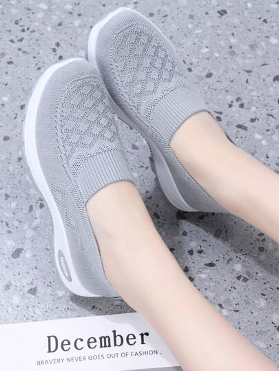 大码女士休闲运动鞋,透气针织鞋 - 灰色 - 查看 1