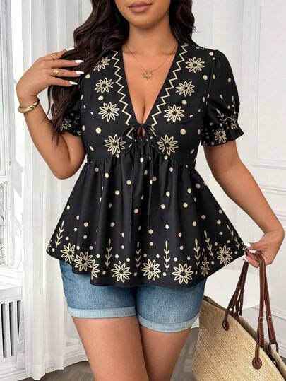 SHEIN Clasi 大码女式花卉印花短袖深 V 领修身衬衫 - 彩色 - 查看 1