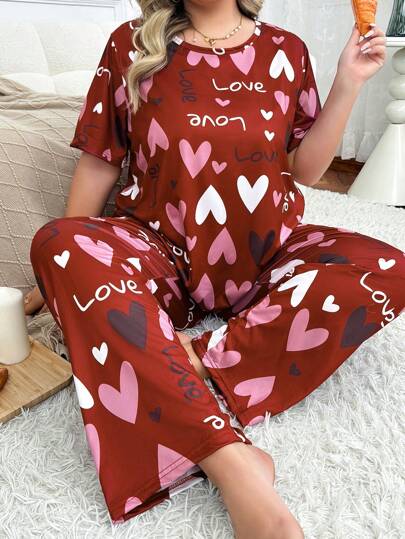 大码女士心形和字母印花短袖上衣和裤子睡衣套装,适合情人节 - 紅色 - 查看 1