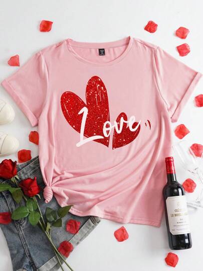 SHEIN LUNE 大码女式爱情字母和心形印花圆领短袖休闲上衣,适合情人节礼物 - 白色 - 查看 1