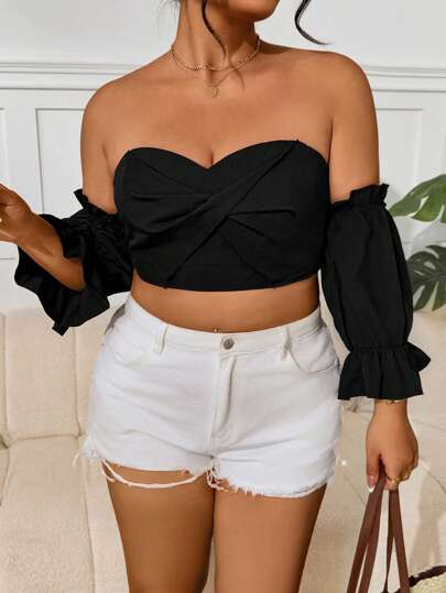 SHEIN VCAY 大码女式露肩短袖扭纹前短款上衣 - 黑色 - 查看 1