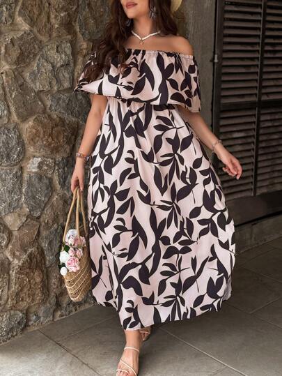 SHEIN VCAY 大码女式植物印花露肩荷叶边下摆度假连衣裙 - 彩色 - 查看 1