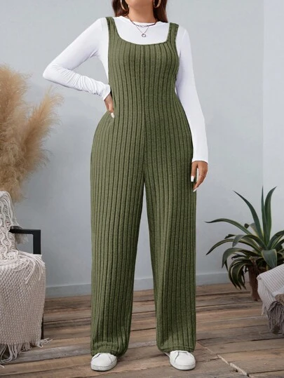 SHEIN LUNE 大码女式纯色罗纹连体裤,秋季假日装 - 軍綠色 - 查看 1