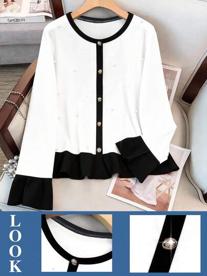 大码女式优雅撞色滚边和仿珍珠装饰长袖 T 恤,适合工作和通勤,春秋季