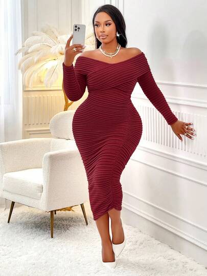 大码女式露肩长袖紧身时尚优雅连衣裙