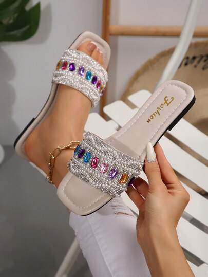 大码女式珍珠宝石露趾拖鞋,平底网络名人风格沙滩拖鞋 - 米色 - 查看 1