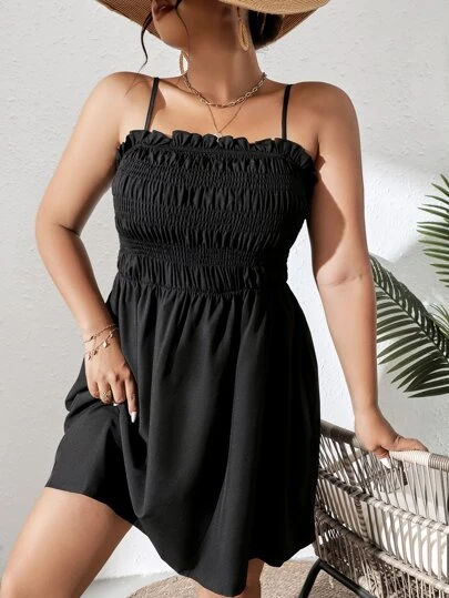 SHEIN Holidaya 大碼素色褶邊吊帶連衣裙 - 黑色 - 查看 1