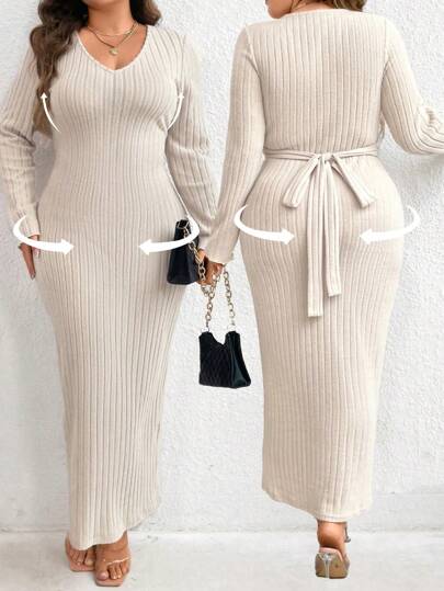 Celure 纯色 V 领罗纹针织紧身连衣裙长款女装 - 杏色 - 查看 1