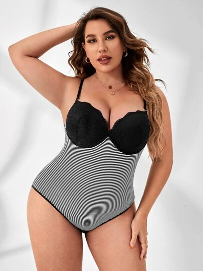 大碼條紋圖案蕾絲拼接性感緊身連體衣 - 黑與白 - 查看 1