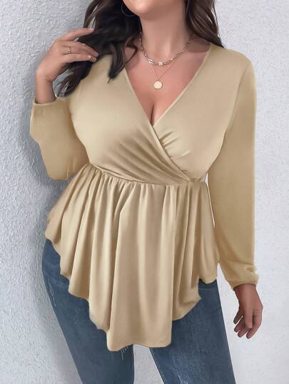 SHEIN Clasi 大碼交疊領荷葉邊下擺T恤 - 香檳色 - 查看 1