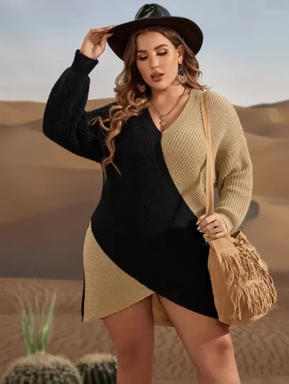 SHEIN Unity 大碼雙色落肩袖交叉毛衣裙 - 彩色 - 查看 1