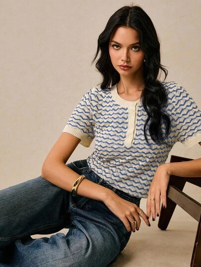 Poéselle 女式休闲拼色条纹短袖针织上衣,秋冬夏季