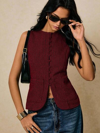 Poéselle 女士时尚通勤格子无袖衬衫 - 紅色 - 查看 1