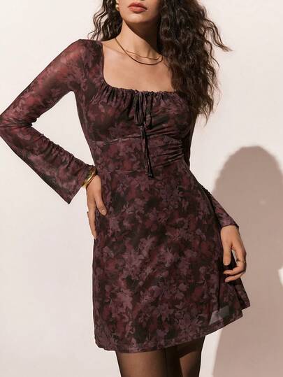 Poéselle 女士花卉网纱植绒方领迷你裙连衣裙 - 酒紅色 - 查看 1