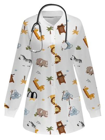 PopScrub 可爱卡通动物园动物大象考拉狮子长颈鹿斑马印花磨砂制服夹克 - 白色 - 查看 1