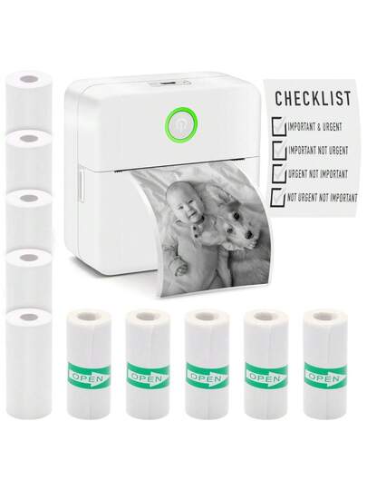 便攜式小型熱敏打印機,配有10捲紙張無線bt 203dpi相片標籤備忘錄錯題打印,配有usb電纜印表機 - 白色 - 查看 1
