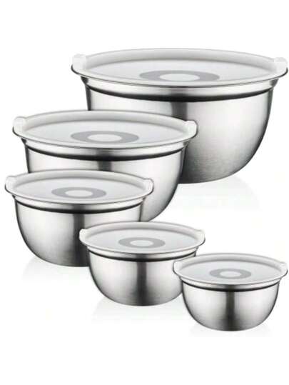 Premium Stainless-Steel Mixing Bowls With Airtight Lids (Set Of 5) Nesting Bowls For Space-Saving Storage, Easy-Grip Stability Design Mixing-Bowl Set Versatile For Cooking, Baking, Food Storage - 銀色 - 查看 1