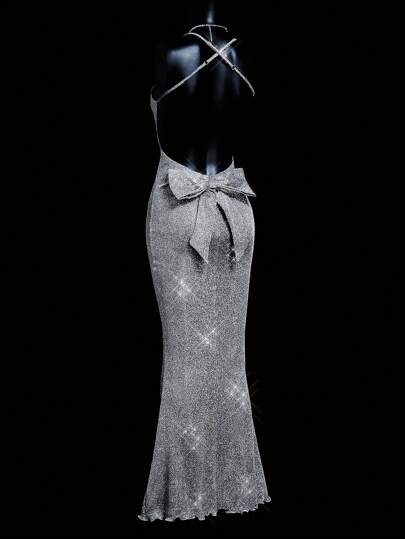 SHEIN ICON 细肩带深 V 领露背蝴蝶结装饰紧身鱼尾长裙 - 銀色 - 查看 1